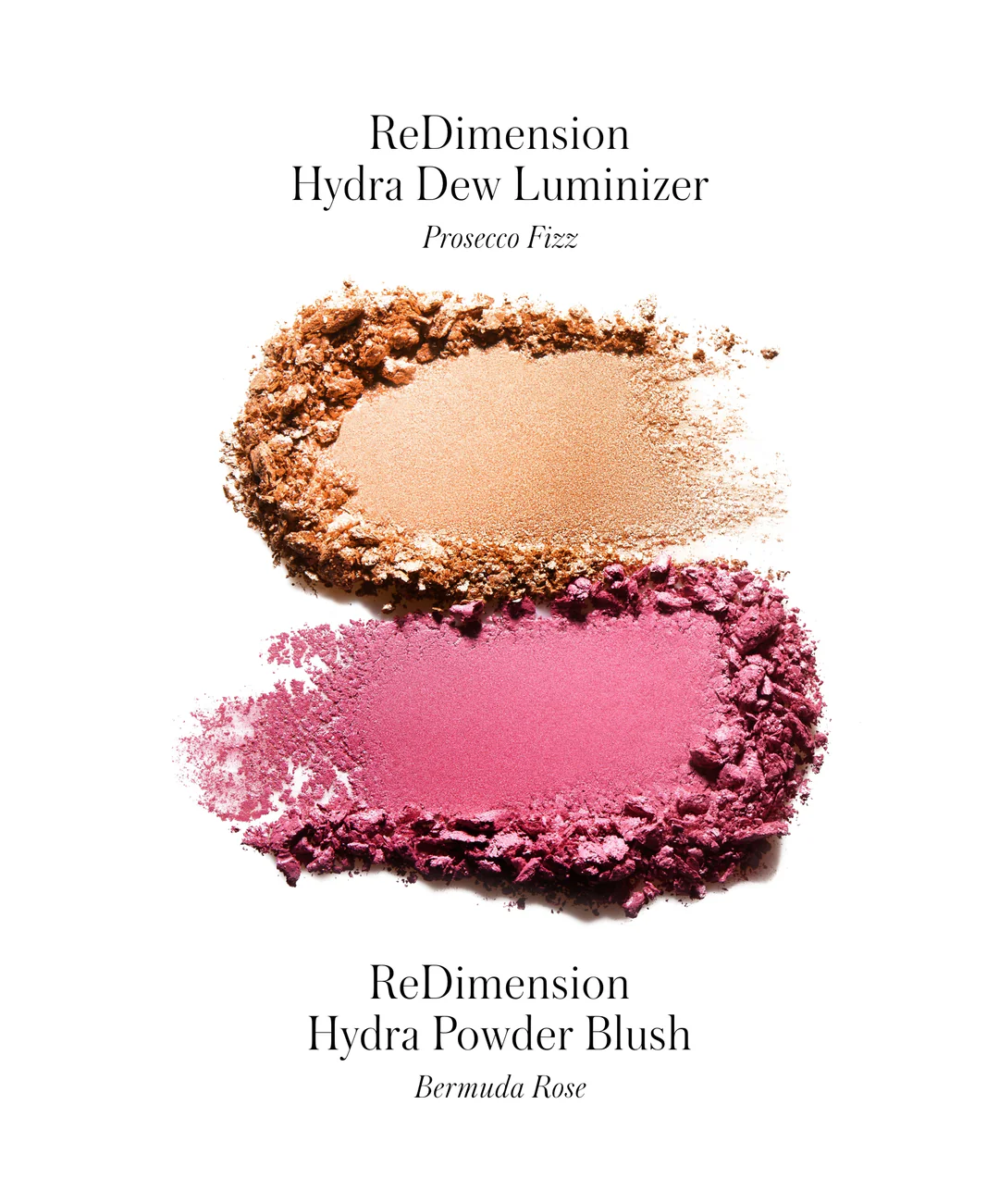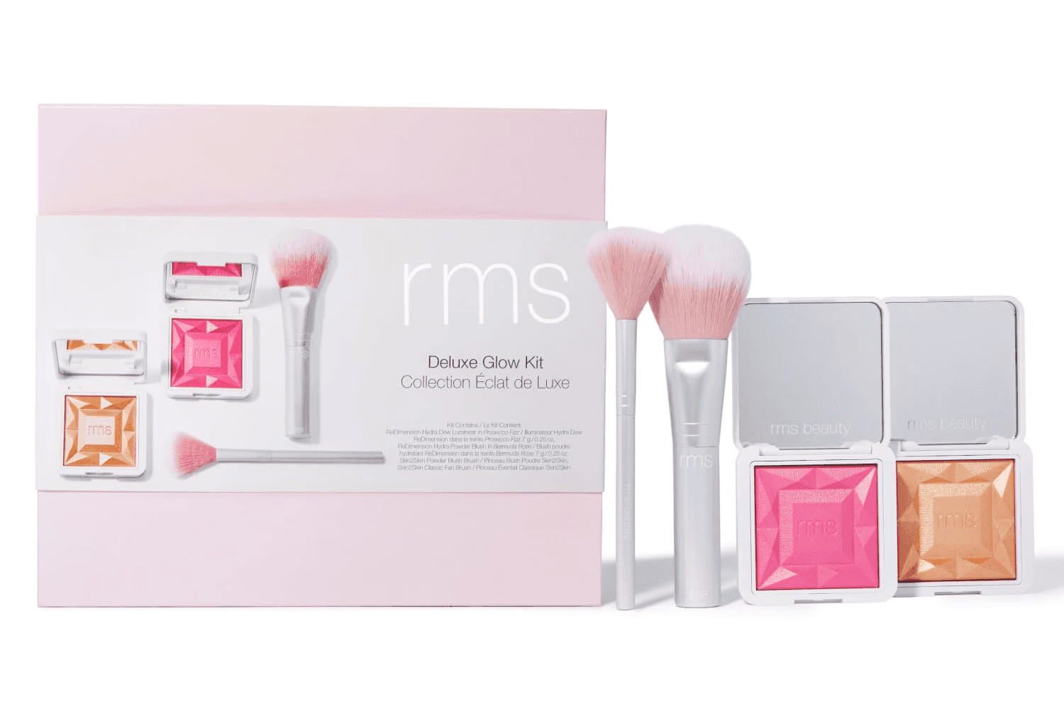 What's inside? 4 piece set that includes two ReDimension Hydra Dew Luminizers in Prosecco Fizz and Bermuda Rose, and two brushes - RMS Skin2Skin powder blush brush and the Skin2Skin classic fan brush, made with vegan goat hair.