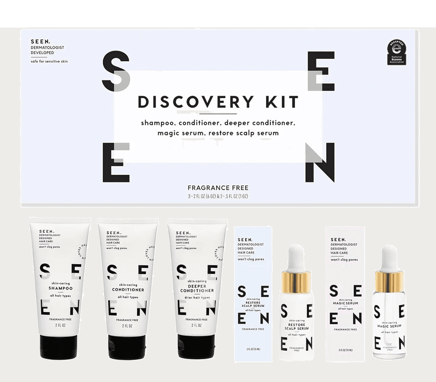 What's inside? 5 fragrance-free products - SEEN Shampoo, Conditioner, Deeper Conditioner, Magic Serum and Restore Scalp Serum. For reviews and ingredients discussing some of these products, check out our blog post Fragrance-Free Shampoos: Embrace Pure and Gentle Hair Care.